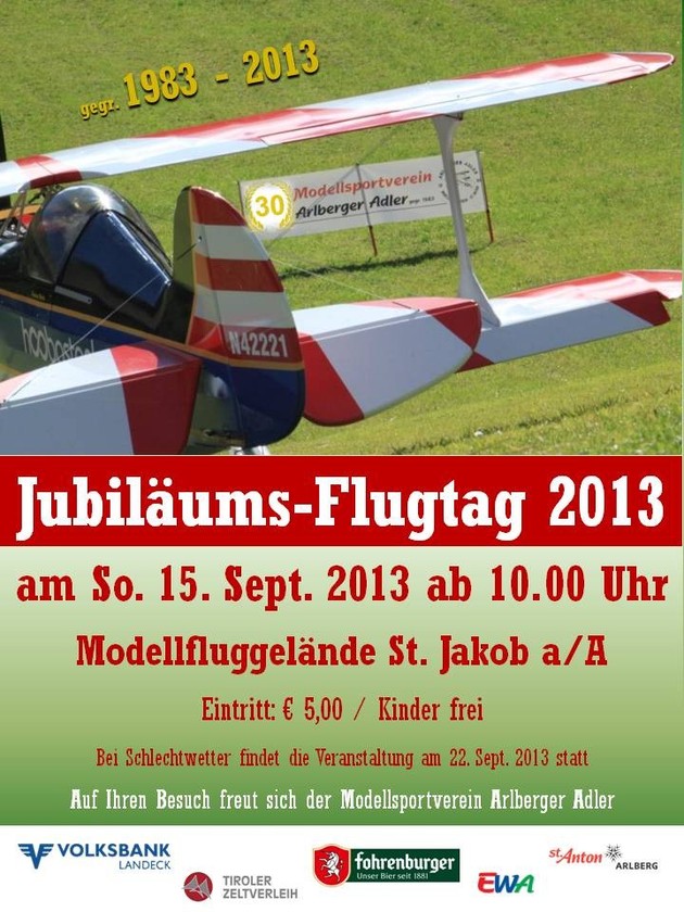 Auf zahlreiche Höhepunkte und Erfolge in der 30-jährigen Vereinsgeschichte der Arlberger Adler kann bereits zurückgeblickt werden. Anlaß genug, dieses Bestandsjubiläum mit einer ausgiebigen Jubiläums-Flugshow am 15. September 2013 am Modellflugplatz in St. Jakob a/A zu feiern.