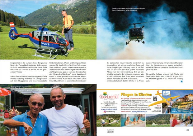Obwohl zahlreiche Piloten ihre Teilnahme für heuer aufgrund der Corona-Pandemie frühzeitig abgesagt haben, folgten in der Heli-Szene namhafte Piloten aus der Schweiz, Deutschland, Italien, Frankreich, Belgien sowie dem Inland der Einladung von Ewald Heim und genossen vom 15. bis 21. August 2020 die gemütliche familiäre Atmosphäre der Arlberger Adler. Dem Umstand zu verdanken, daß coronabedingt kaum Heli-Treffen durchgeführt wurden, konnte dieses Jahr das Teilnehmerfeld um weitere zahlreiche sehenswerte und bewundernswerte Modellnachbauten erweitert werden. Erstmals konnten mit dem belgischen Teampiloten Francis Paduwat Vario Helicopter, mit Strupf Matthias von Heli-Classic und Pahl Gerhard von Pahl-Turbinen namhafte Hersteller am Modellfluggelände in St. Anton am Arlberg begrüßt werden.