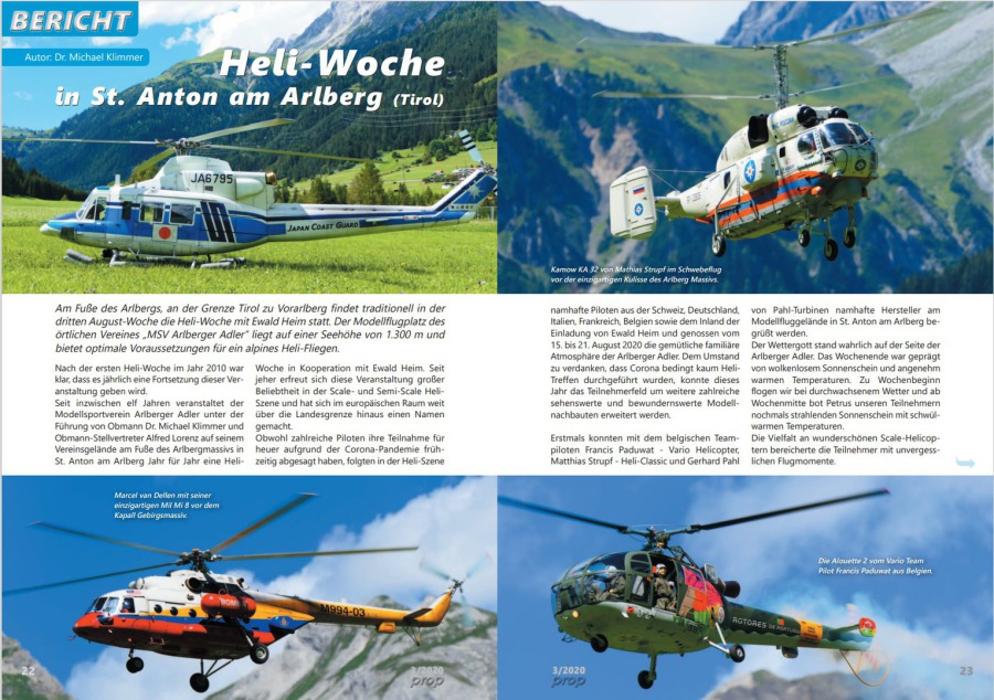 Seit inzwischen 11 Jahren veranstaltet der Modellsportverein Arlberger Adler unter der Führung von Obmann Dr. Michael Klimmer und Obmann-Stellvertreter Alfred Lorenz auf seinem Vereinsgelände am Fuße des Arlbergmassiv in St. Anton am Arlberg Jahr für Jahr eine Heli-Woche in Kooperation mit Ewald Heim. Seit jeher erfreut sich diese Veranstaltung großer Beliebtheit in der Scale- und Semi-Scale Heli-Szene und hat sich im europäischen Raum weit über die Landesgrenze einen Namen gemacht.