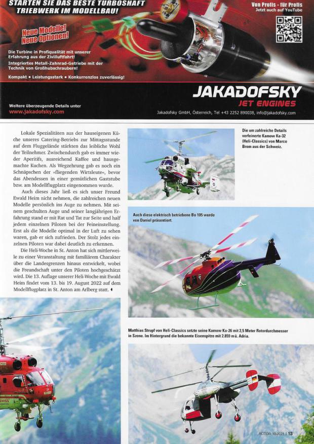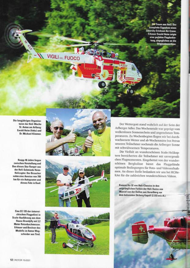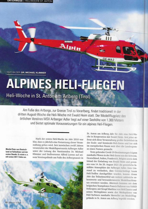 Seit inzwischen 12 Jahren veranstaltet der Modellsportverein Arlberger Adler unter der Führung von Obmann Dr. Michael Klimmer und Obmann-Stellvertreter Alfred Lorenz auf seinem Vereinsgelände am Fuße des Arlbergmassiv in St. Anton am Arlberg Jahr für Jahr eine Heli-Woche in Kooperation mit Ewald Heim. Seit jeher erfreut sich diese Veranstaltung großer Beliebtheit in der Scale- und Semi-Scale Heli-Szene und hat sich im europäischen Raum weit über die Landesgrenze einen Namen gemacht.